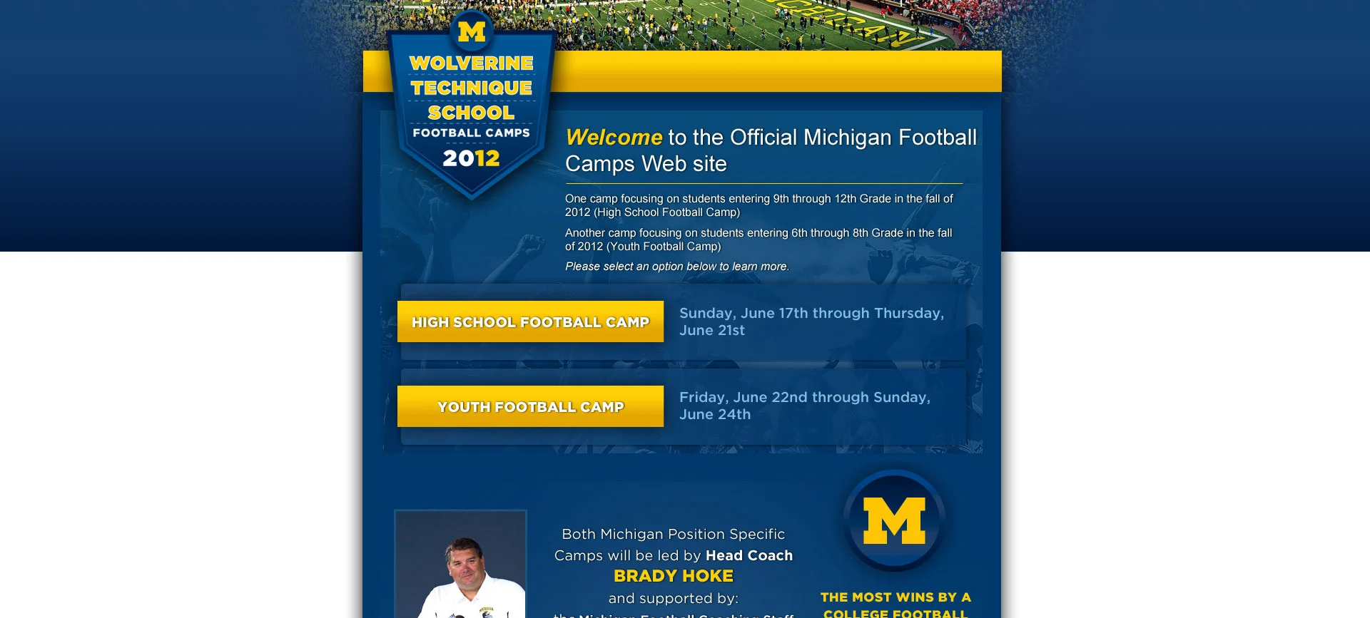 Working with Rich Rodriguez and then Brady Hoke, we at 77interactive, a startup I was a partner of, designed, developed custom templating for Wordpress, and implemented the design and custom templating for the University of Michigan Football Camp. This camp was setup to provide Youth and High School Football training for kids. We managed content and ongoing design changes for the management of the Camp.
